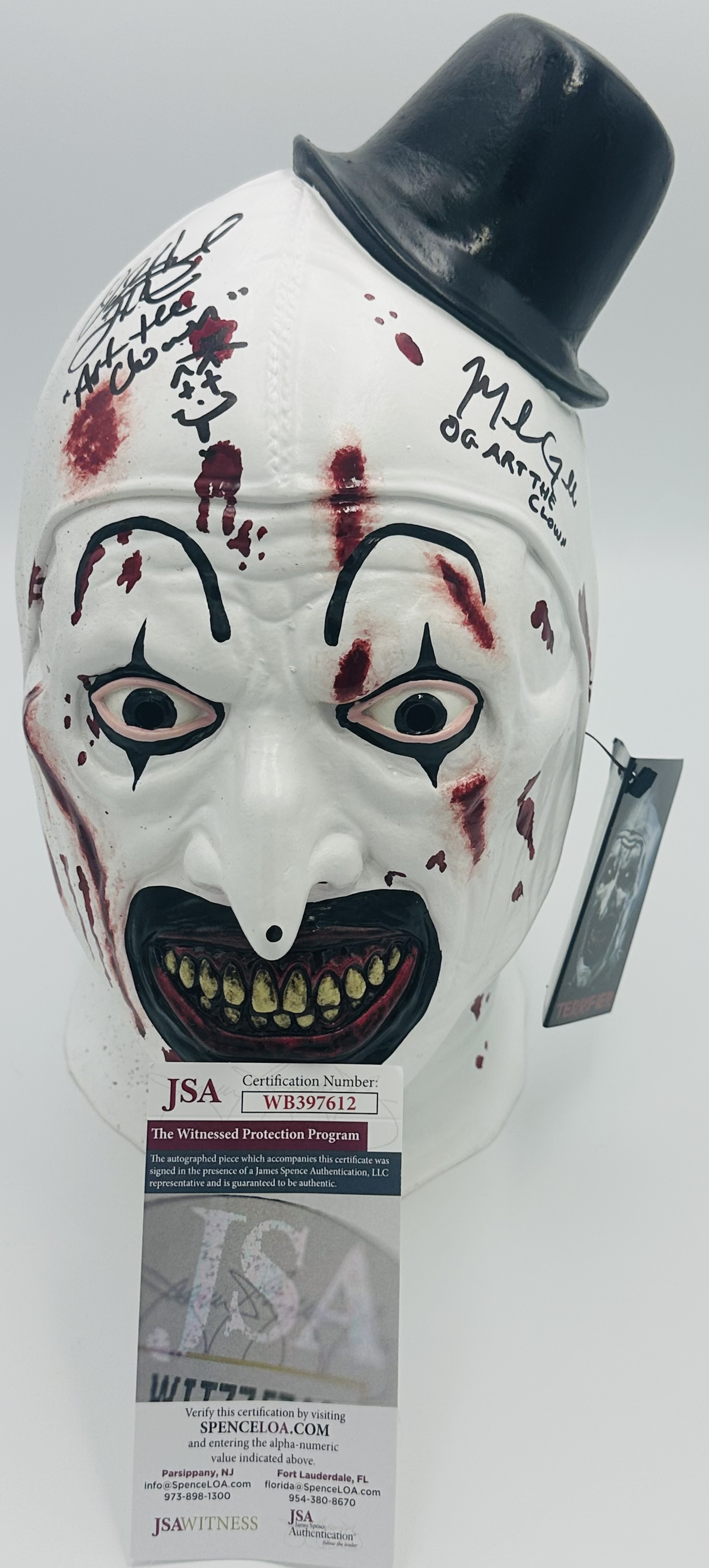 Own a rare and highly collectible piece of horror history with this David Howard Thornton & Mike Giannelli Signed Art the Clown Mask – BAS Certified, featuring signatures from two actors who brought Art the Clown to life.