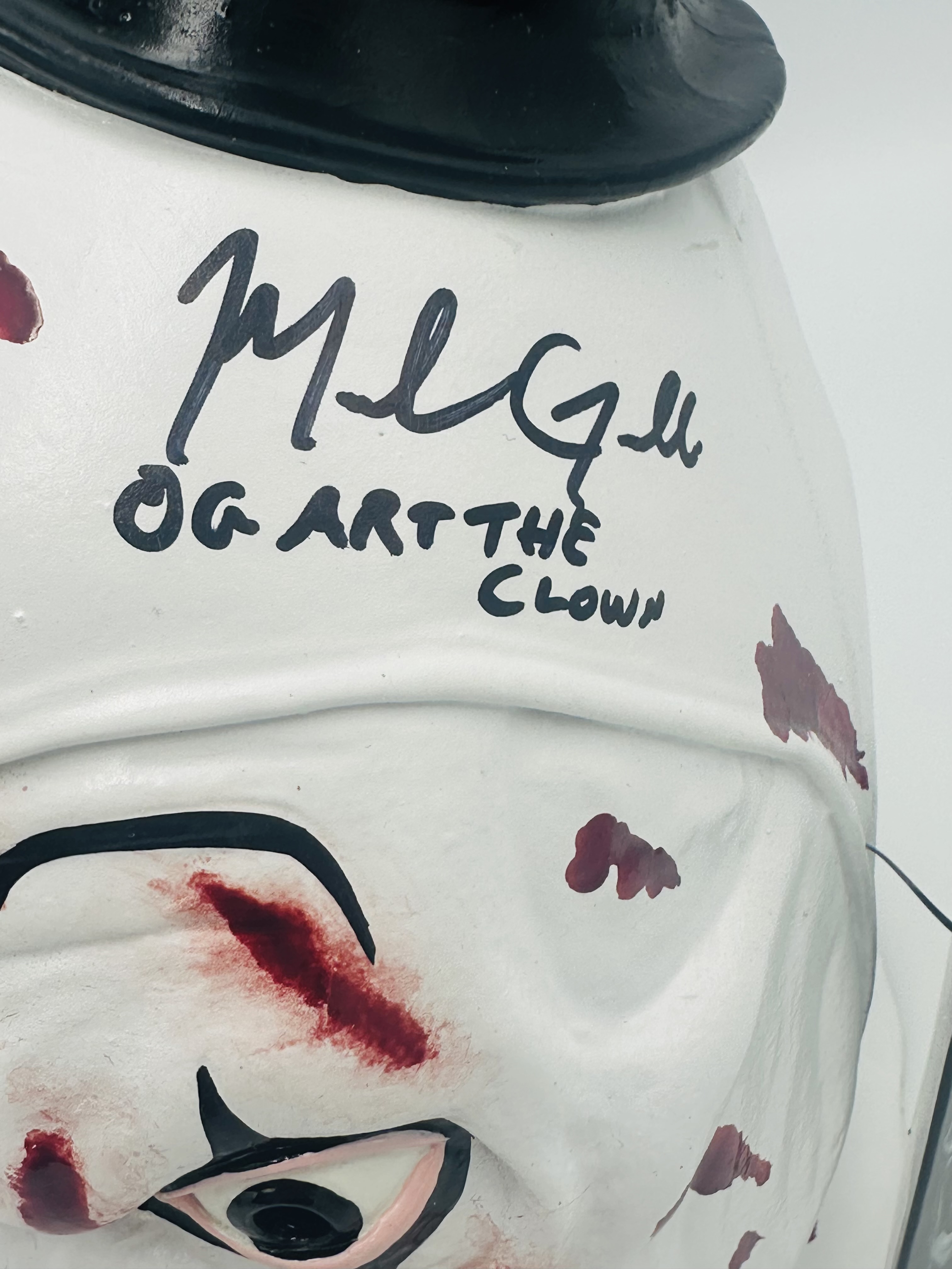This Art the Clown mask has been personally hand-signed by David Howard Thornton and Mike Giannelli, both known for portraying Art the Clown in the Terrifier franchise and earlier appearances.