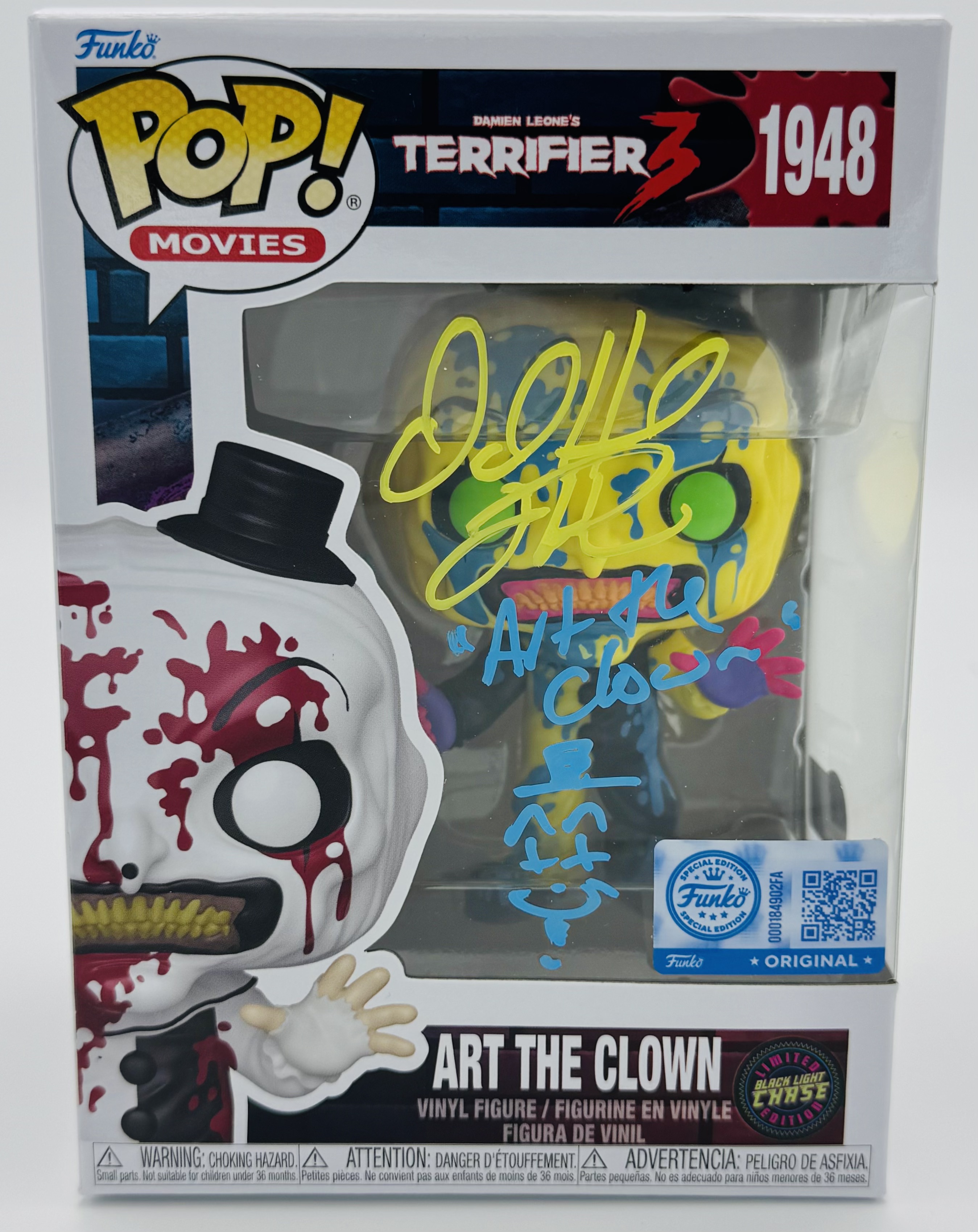 This Art the Clown Chase Funko Pop #1948 has been personally hand-signed by David Howard Thornton, who brought to life the terrifying character Art the Clown in the Terrifier film series, including Terrifier 3.