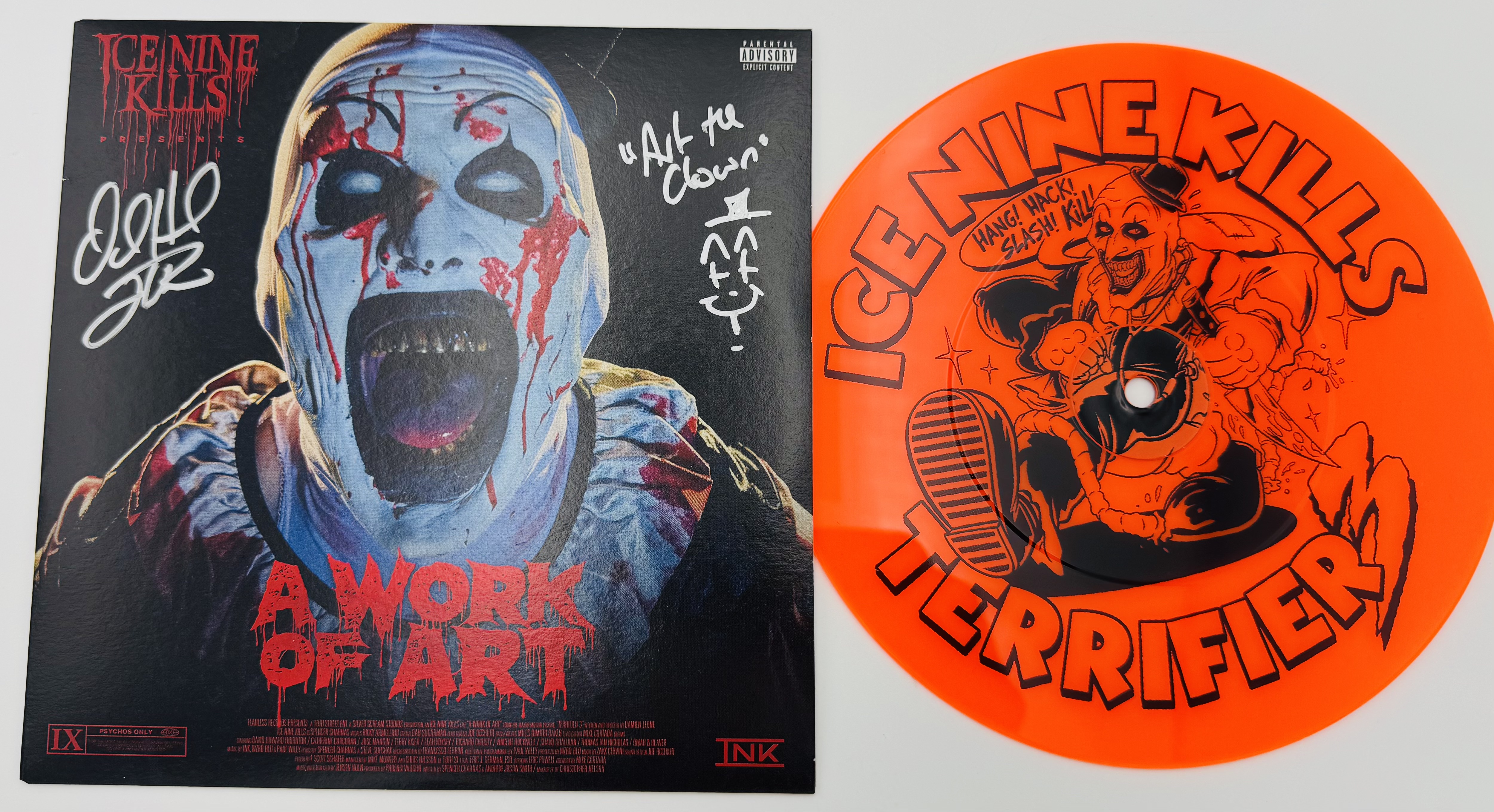 This 7″ vinyl record has been personally hand-signed by David Howard Thornton, best known for his terrifying portrayal of Art the Clown in the cult horror franchise Terrifier.