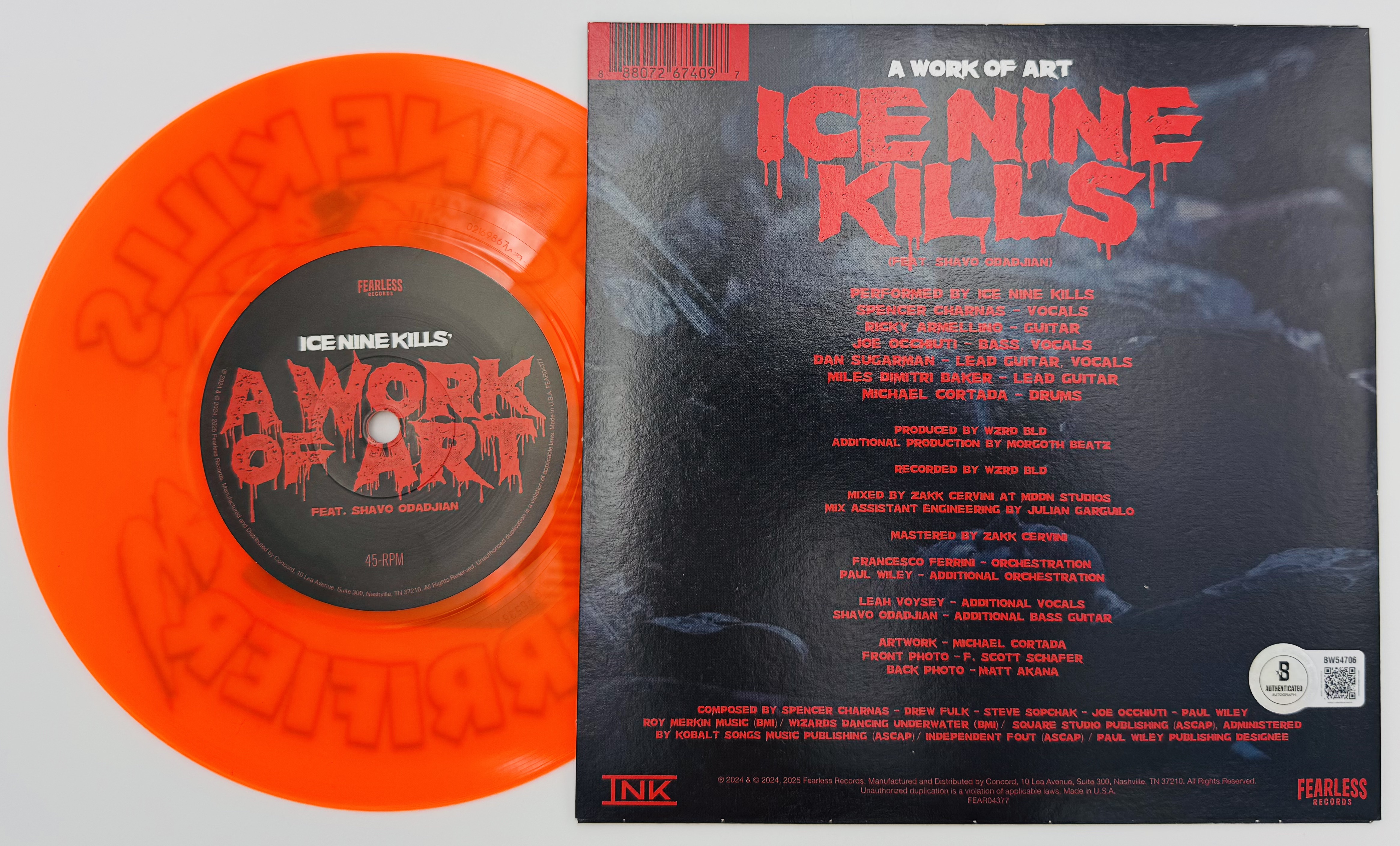 Secure this David Howard Thornton Signed Ice Nine Kills 7″ Vinyl – BAS Certified today and add a distinctive horror collectible to your collection.