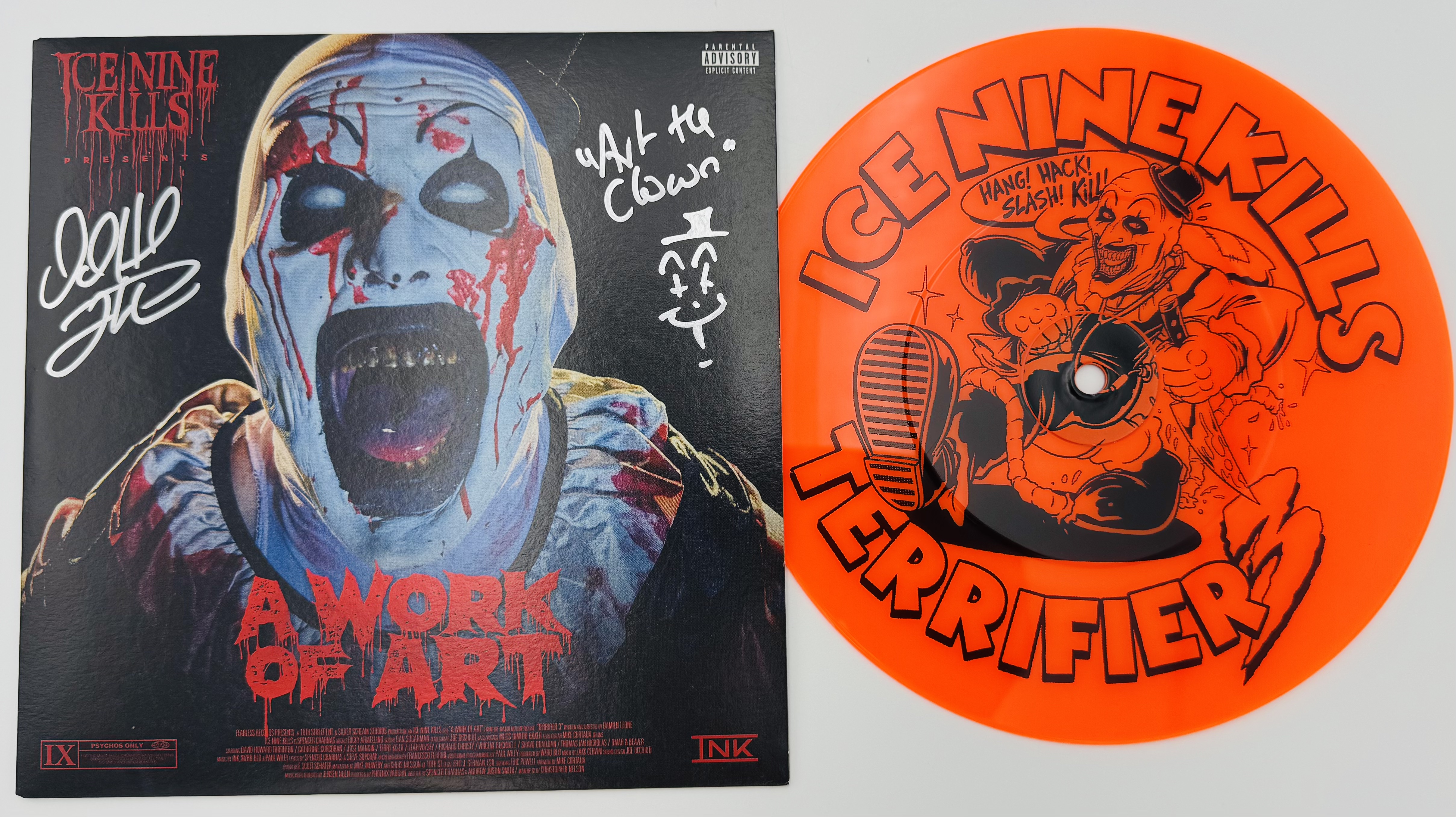 This 7″ vinyl record has been personally hand-signed by David Howard Thornton, best known for his terrifying portrayal of Art the Clown in the cult horror franchise Terrifier.