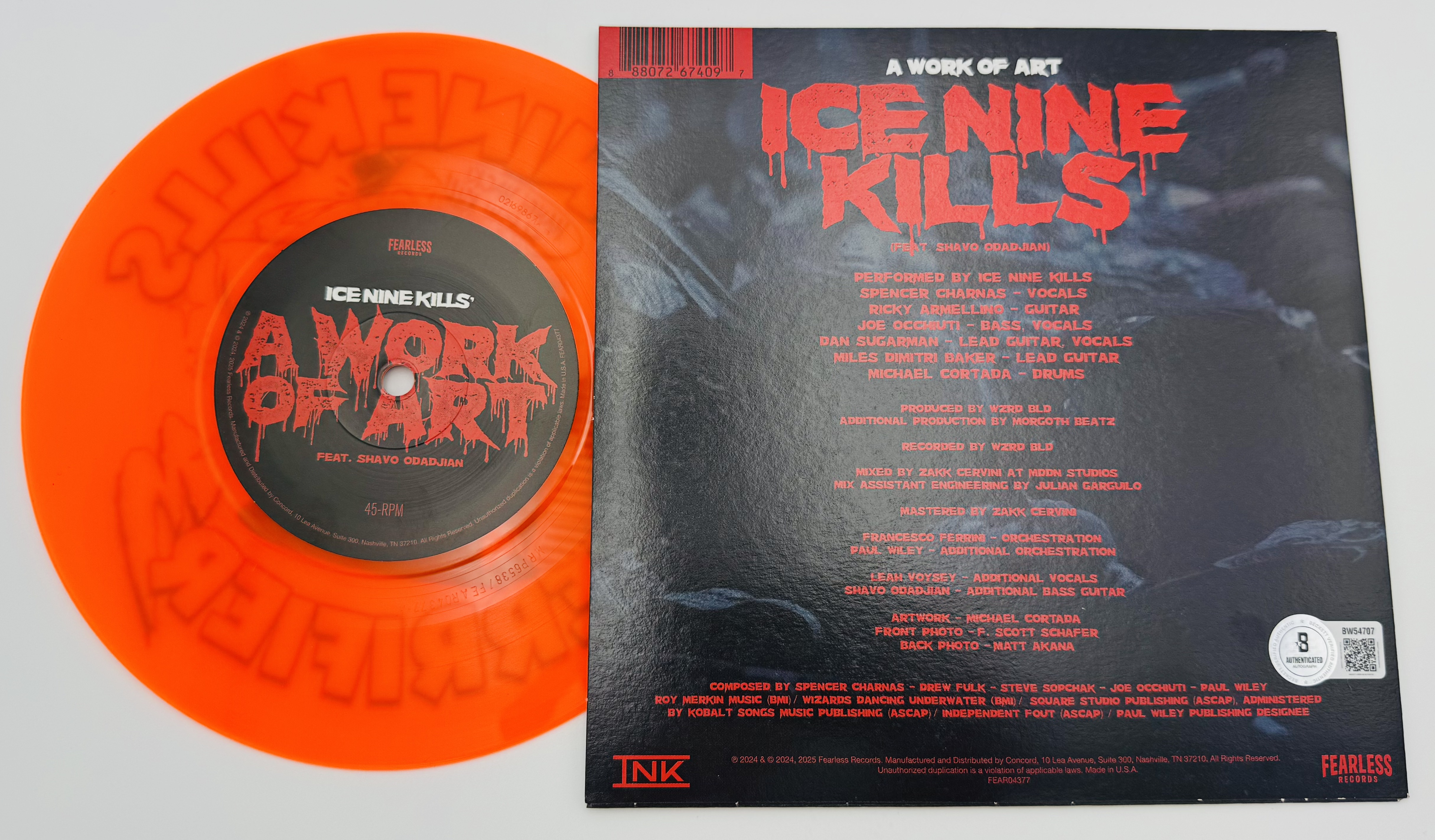 Secure this David Howard Thornton Signed Ice Nine Kills 7″ Vinyl – BAS Certified today and add a distinctive horror collectible to your collection.