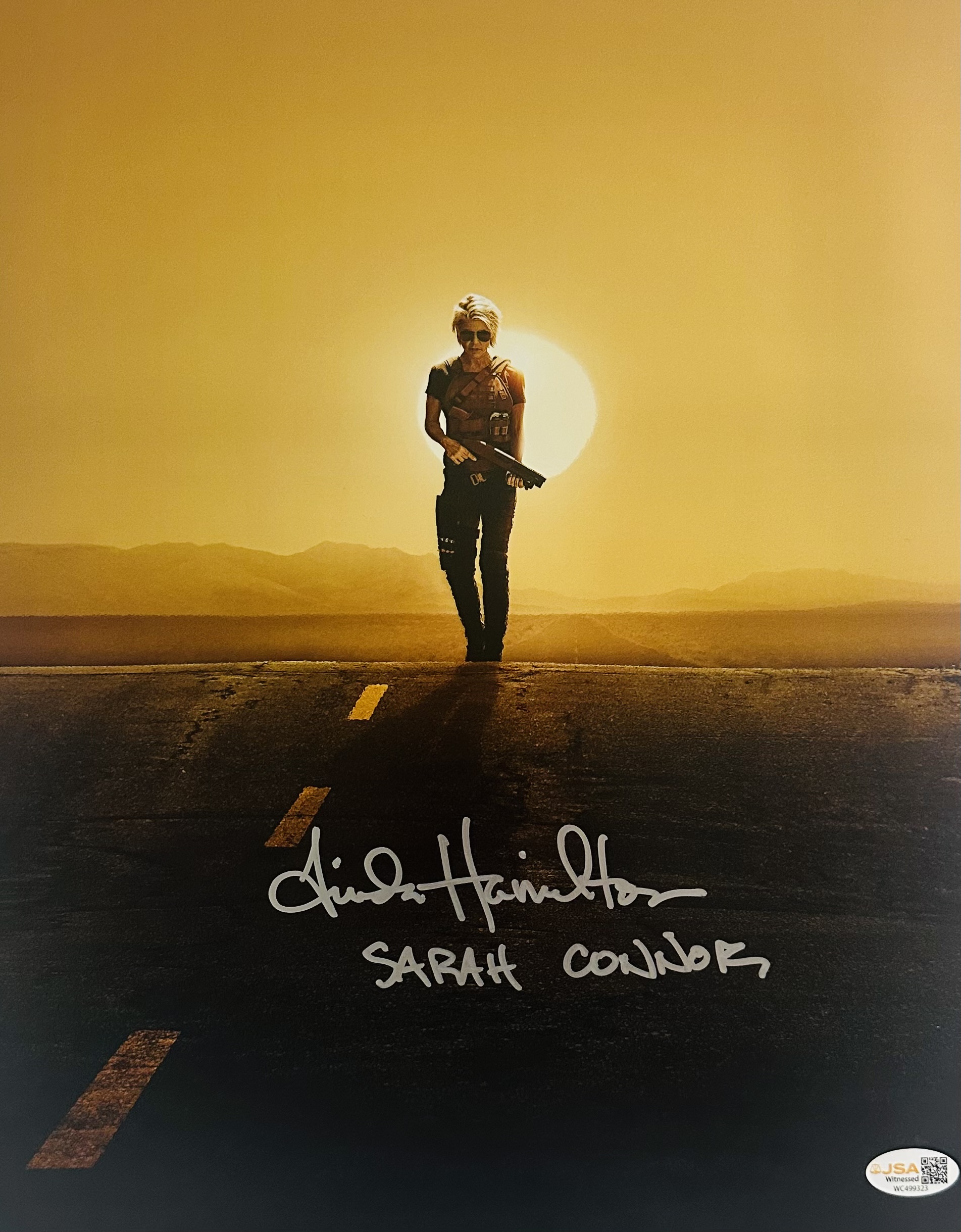 This 11×14 photo has been personally hand-signed by Linda Hamilton, who portrayed Sarah Connor in the Terminator franchise.