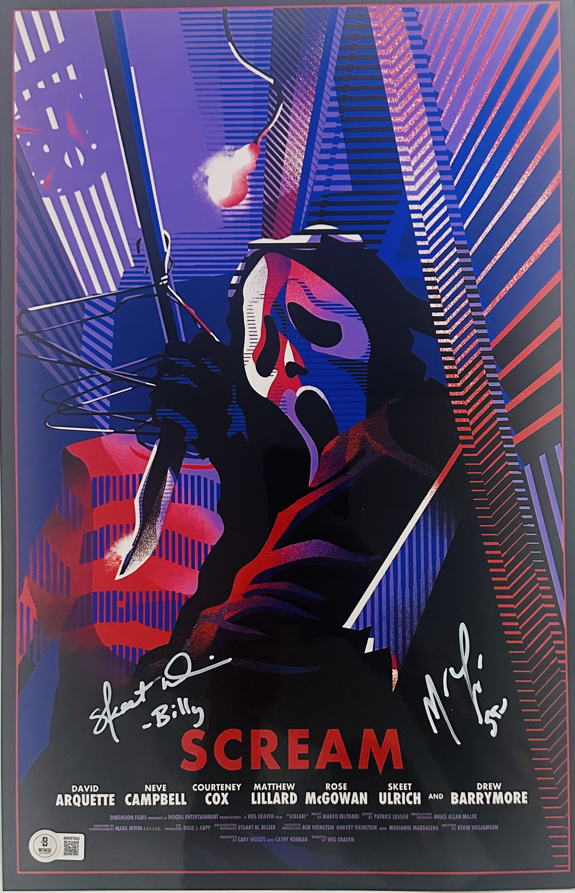 This 11×17 photo has been personally hand-signed by Matthew Lillard and Skeet Ulrich, who portrayed Stu Macher and Billy Loomis — the original Ghostface killers in Scream.