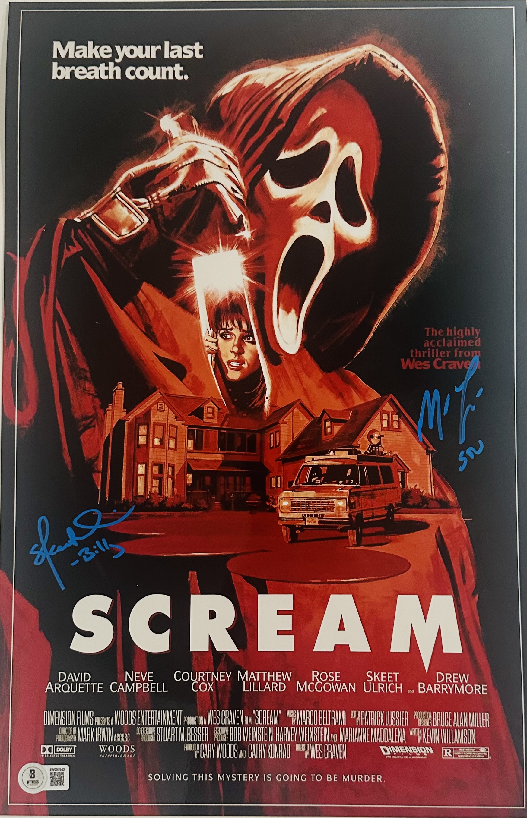 This 11×17 photo has been personally hand-signed by Matthew Lillard and Skeet Ulrich, who portrayed Stu Macher and Billy Loomis — the original Ghostface killers in Scream.