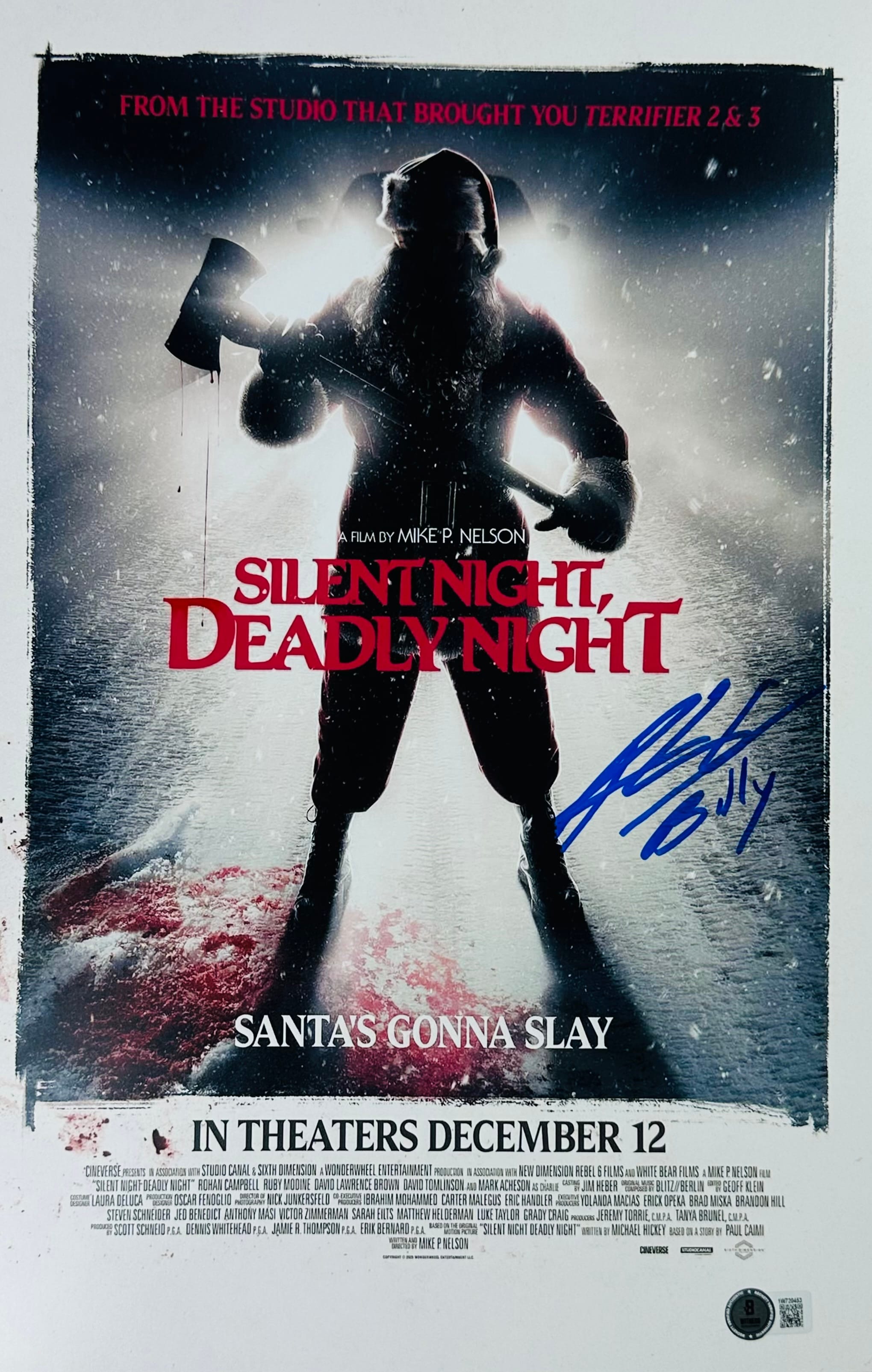 Add a chilling piece of modern horror memorabilia to your collection with this Rohan Campbell signed Silent Night, Deadly Night 11×17 photo. This high-quality collectible features a bold autograph from Rohan Campbell, who portrays the terrifying new version of Billy in the reboot of the cult classic slasher film Silent Night, Deadly Night.